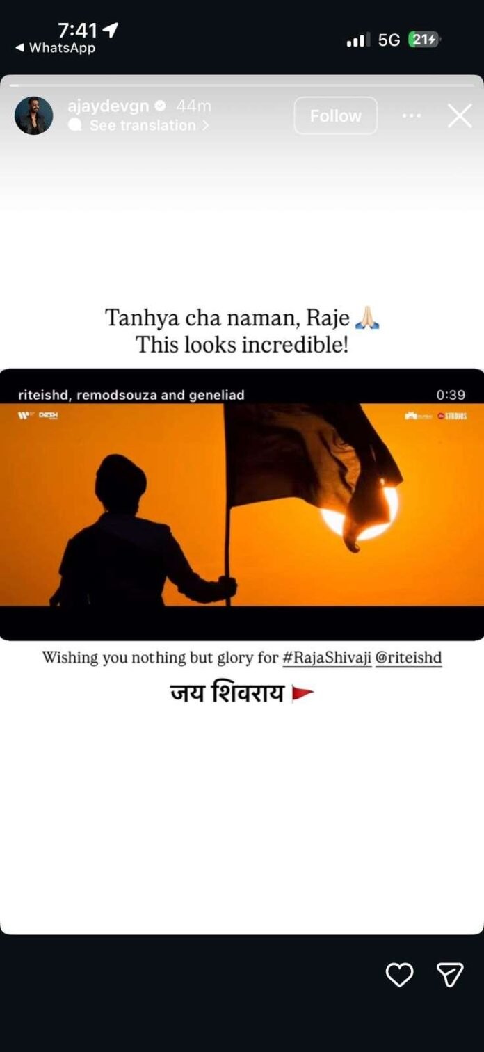Actor Ajay Devgn has now fueled the excitement by extending a warm shoutout to Raja Shivaji and Riteish Deshmukh. The actor, who headlined Tanhaji: The Unsung Warrior (2020), made his support even more special by extending his salute as ‘Tanhaji’, the trusted lieutenant of Chhatrapati Shivaji Maharaj. Sharing the Hindi version of Raja Shivaji Anthem ‘Chhatrapati’ on his Instagram stories, Ajay Devgn wrote, “Tanhya chya naman, Raje! This looks incredible! Wishing you nothing but glory for #RajaShivaji @riteishd Jai Shivray!”